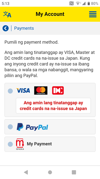- Ang recharges sa pamamagitan ng VISA at MasterCard cards na na-issue sa Japan ay hindi maaaring magamit sa international recharges, credit transfers, SMS purchases, o sa anumang serbisyo maliban sa pagtawag. Kung nais gamitin ang mga nasabing serbisyo, mangyari lamang na magbayad sa pamamagitan ng PayPal.