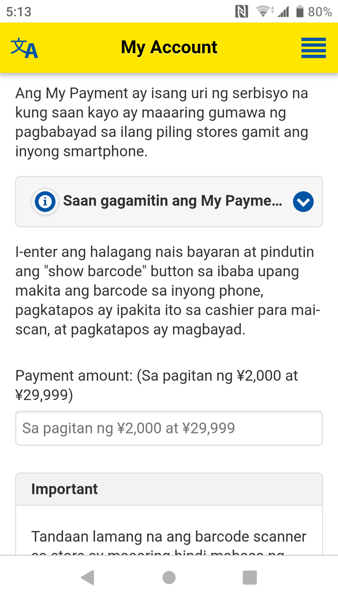 Automatic Recharge (para sa VISA at MasterCard cards na na-issue lamang sa Japan) I-set ang auto-recharge option kung magbabayad sa pamamagitan ng credit card at ang inyong account ay awtomatikong mare-recharge kapag ang balanse ay bumaba na sa itinakdang halaga. |